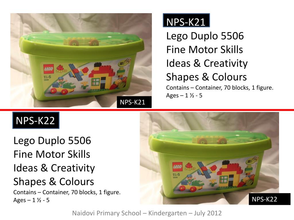 NPS-K21 Lego Duplo 5506 Fine Motor Skills Ideas & Creativity Shapes & Colours Contains – Container, 70 blocks, 1 figure. Ages – 1 ½ - 5 NPS-K22 Lego Duplo 5506 Fine Motor Skills Ideas & Creativity Shapes & Colours Contains – Container, 70 blocks, 1 figure. Ages – 1 ½ - 5 NPS-K21 NPS-K22 Lego Duplo 5506 Fine Motor Skills Ideas & Creativity Shapes & Colours Contains – Container, 70 blocks, 1 figure. Ages – 1 ½ - 5 NPS-K22 Naidovi Primary School – Kindergarten – July 2012