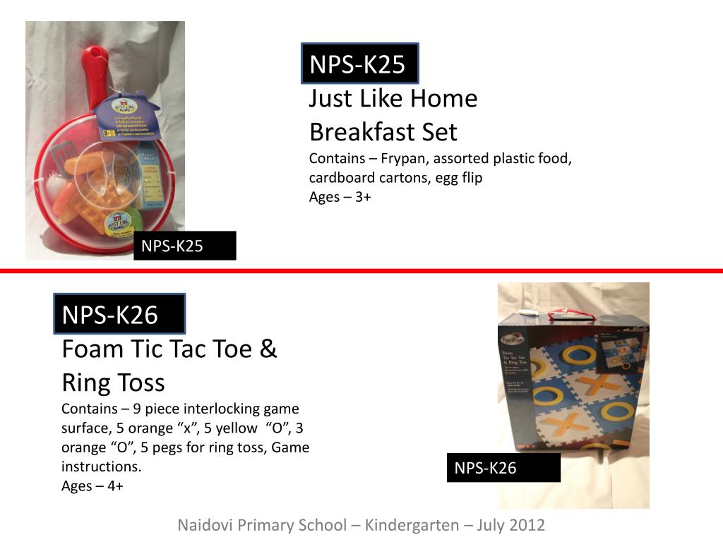 NPS-K25 Just Like Home Breakfast Set Contains – Frypan, assorted plastic food, cardboard cartons, egg flip Ages – 3+ NPS-K25 NPS-K26 Foam Tic Tac Toe & Ring Toss Contains – 9 piece interlocking game surface, 5 orange “x”, 5 yellow “O”, 3 orange “O”, 5 pegs for ring toss, Game instructions. Ages – 4+ NPS-K26 Naidovi Primary School – Kindergarten – July 2012