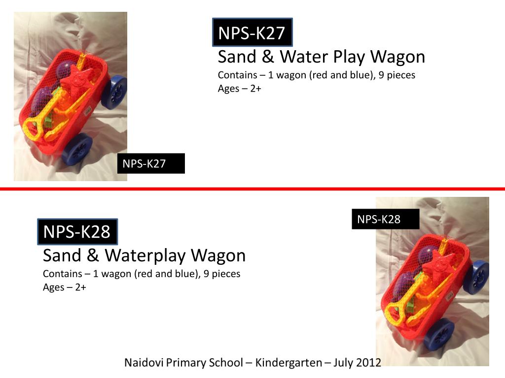 NPS-K27 Sand & Water Play Wagon Contains – 1 wagon (red and blue), 9 pieces Ages – 2+ NPS-K27 NPS-K28 NPS-K28 Sand & Waterplay Wagon Contains – 1 wagon (red and blue), 9 pieces Ages – 2+