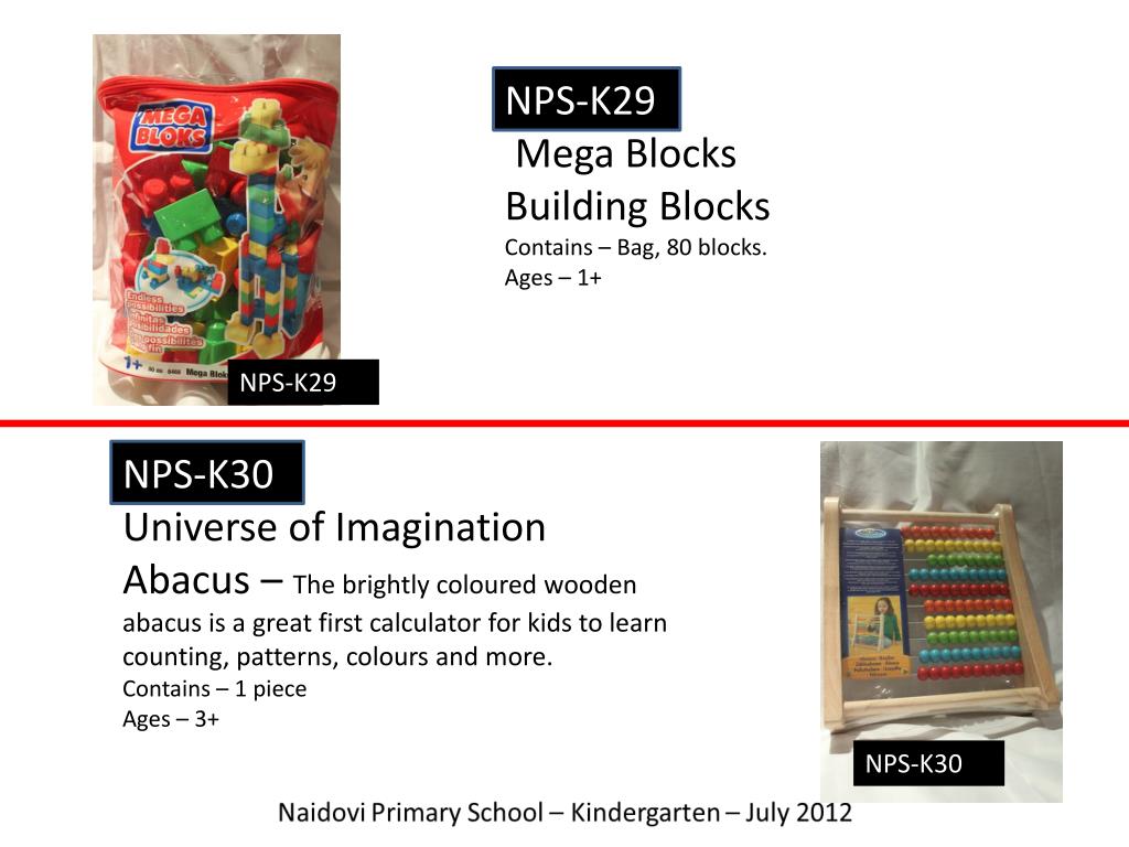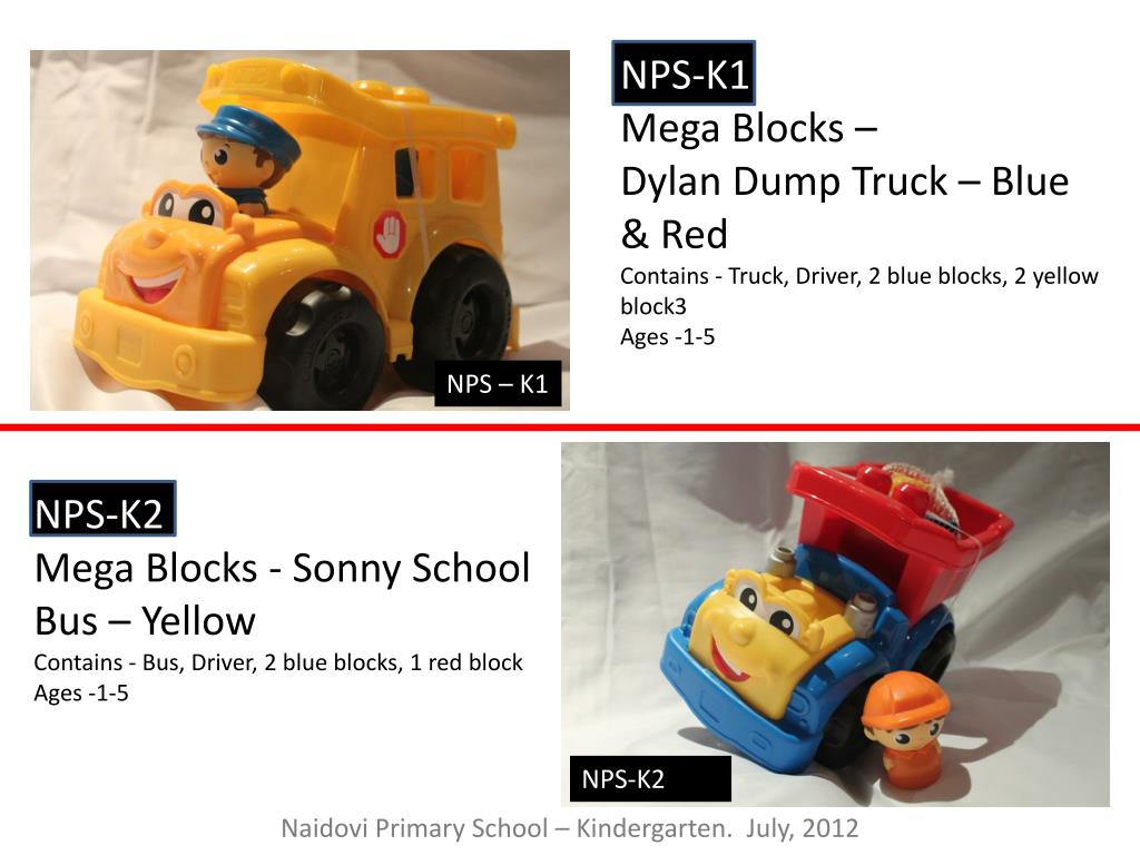 NPS-K1 Mega Blocks – Dylan Dump Truck – Blue & Red Contains - Truck, Driver, 2 blue blocks, 2 yellow block3 Ages -1-5 NPS – K1 NPS-K2 NPS-K2 Mega Blocks - Sonny School Bus – Yellow Contains - Bus, Driver, 2 blue blocks, 1 red block Ages -1-5 NPS-K2 Naidovi Primary School – Kindergarten. July, 2012
