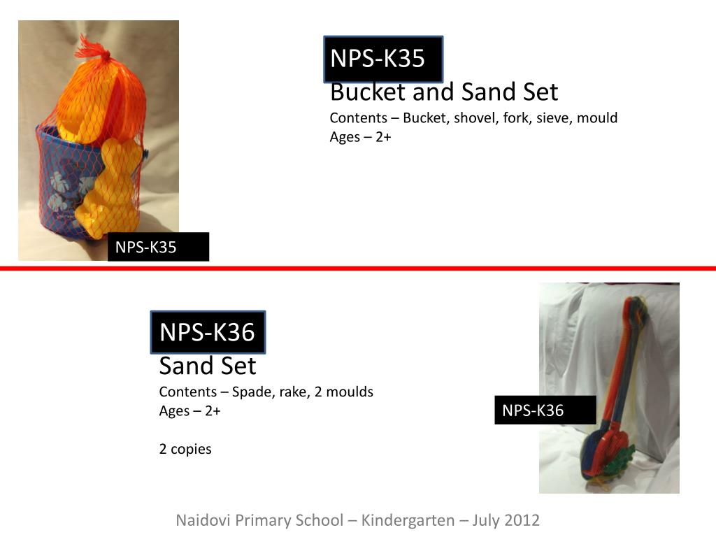 NPS-K35 Bucket and Sand Set Contents – Bucket, shovel, fork, sieve, mould Ages – 2+ NPS-K35 NPS-K36 Sand Set Contents – Spade, rake, 2 moulds Ages – 2+ 2 copies NPS-K36 Naidovi Primary School – Kindergarten – July 2012