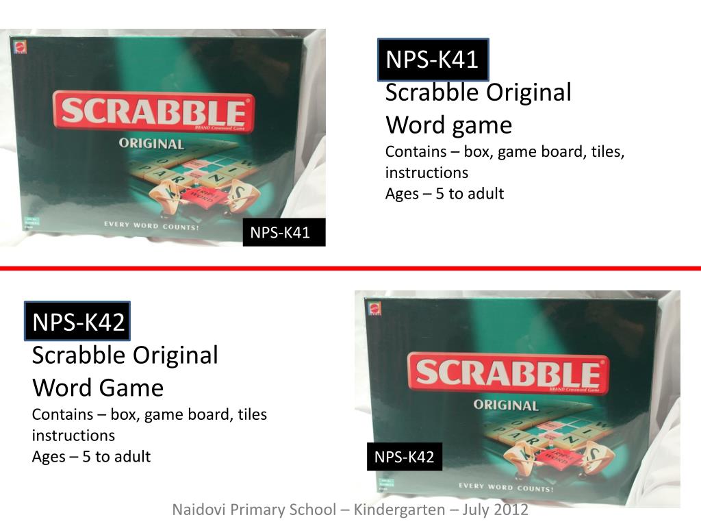 NPS-K41 Scrabble Original Word game Contains – box, game board, tiles, instructions Ages – 5 to adult NPS-K41 NPS-K42 Scrabble Original Word Game Contains – box, game board, tiles instructions Ages – 5 to adult NPS-K42 Naidovi Primary School – Kindergarten – July 2012