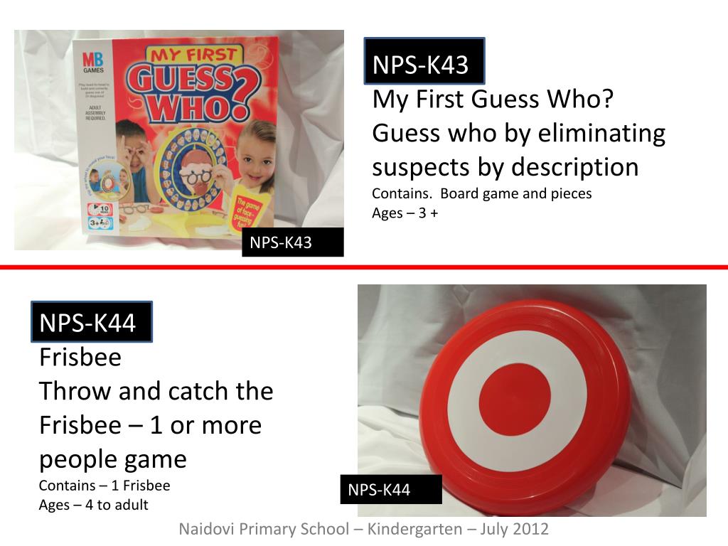 NPS-K43 My First Guess Who? Guess who by eliminating suspects by description Contains. Board game and pieces Ages – 3 + NPS-K43 NPS-K44 Frisbee Throw and catch the Frisbee – 1 or more people game Contains – 1 Frisbee Ages – 4 to adult NPS-K44 Naidovi Primary School – Kindergarten – July 2012