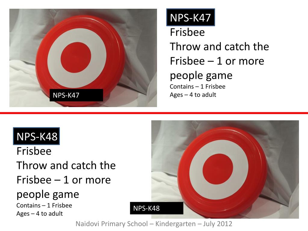 NPS-K47 Frisbee Throw and catch the Frisbee – 1 or more people game Contains – 1 Frisbee Ages – 4 to adult NPS-K47 NPS-K48 Frisbee Throw and catch the Frisbee – 1 or more people game Contains – 1 Frisbee Ages – 4 to adult NPS-K48 Naidovi Primary School – Kindergarten – July 2012