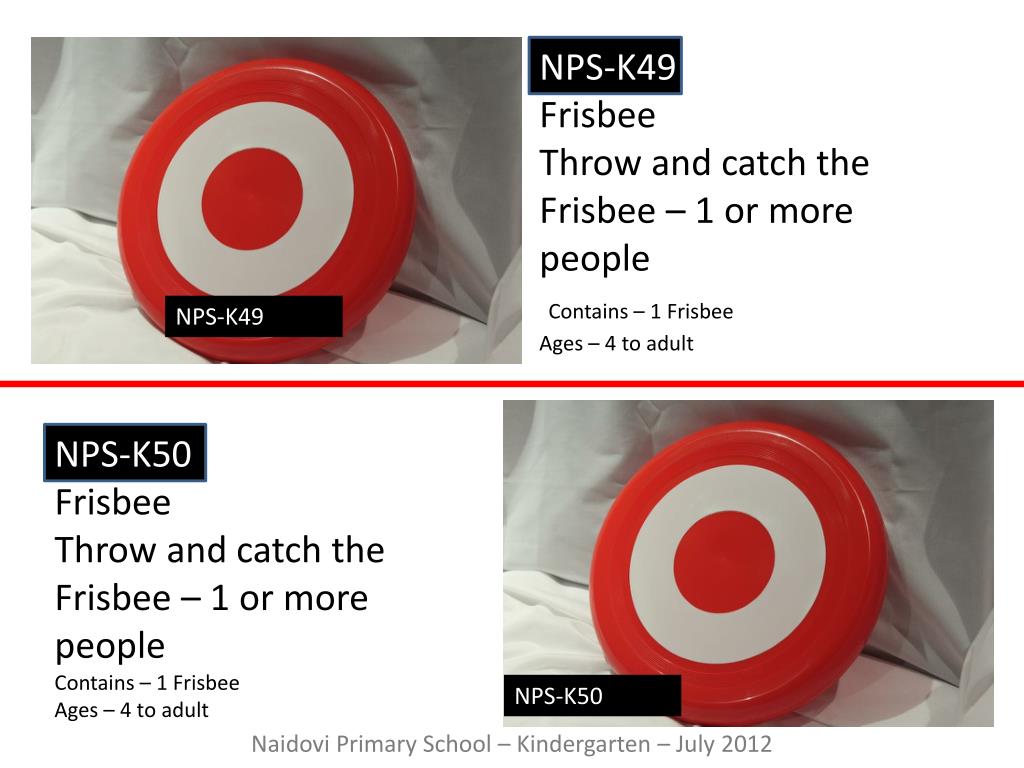 NPS-K49 Frisbee Throw and catch the Frisbee – 1 or more people Contains – 1 Frisbee Ages – 4 to adult NPS-K49 NPS-K50 Frisbee Throw and catch the Frisbee – 1 or more people Contains – 1 Frisbee Ages – 4 to adult NPS-K50 Naidovi Primary School – Kindergarten – July 2012