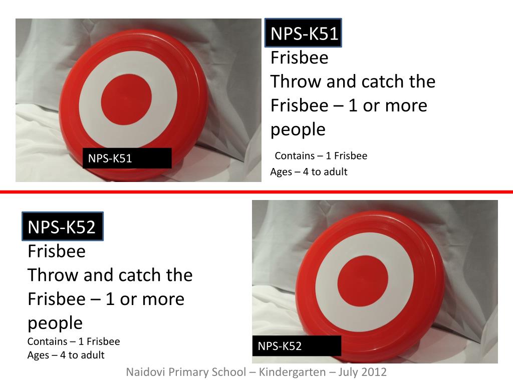 NPS-K51 Frisbee Throw and catch the Frisbee – 1 or more people Contains – 1 Frisbee Ages – 4 to adult NPS-K51 NPS-K52 Frisbee Throw and catch the Frisbee – 1 or more people Contains – 1 Frisbee Ages – 4 to adult NPS-K52 Naidovi Primary School – Kindergarten – July 2012