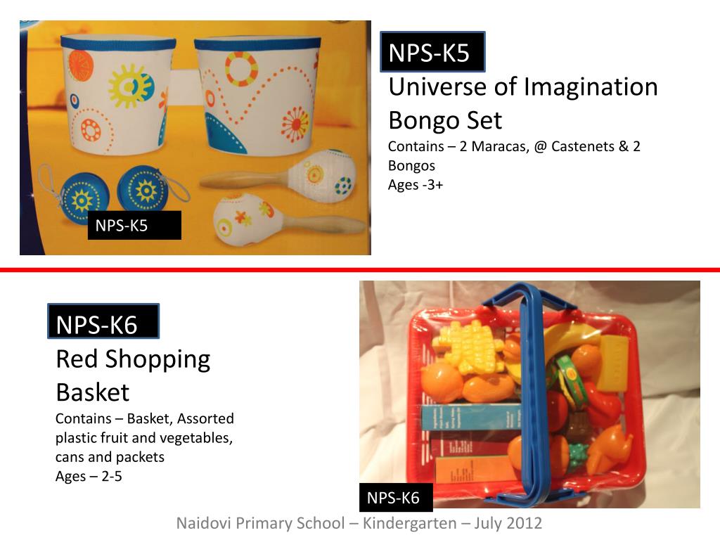 NPS-K5 Universe of Imagination Bongo Set Contains – 2 Maracas, @ Castenets & 2 Bongos Ages -3+ NPS-K5 NPS-K6 Red Shopping Basket Contains – Basket, Assorted plastic fruit and vegetables, cans and packets Ages – 2-5 NPS-K6 Naidovi Primary School – Kindergarten – July 2012