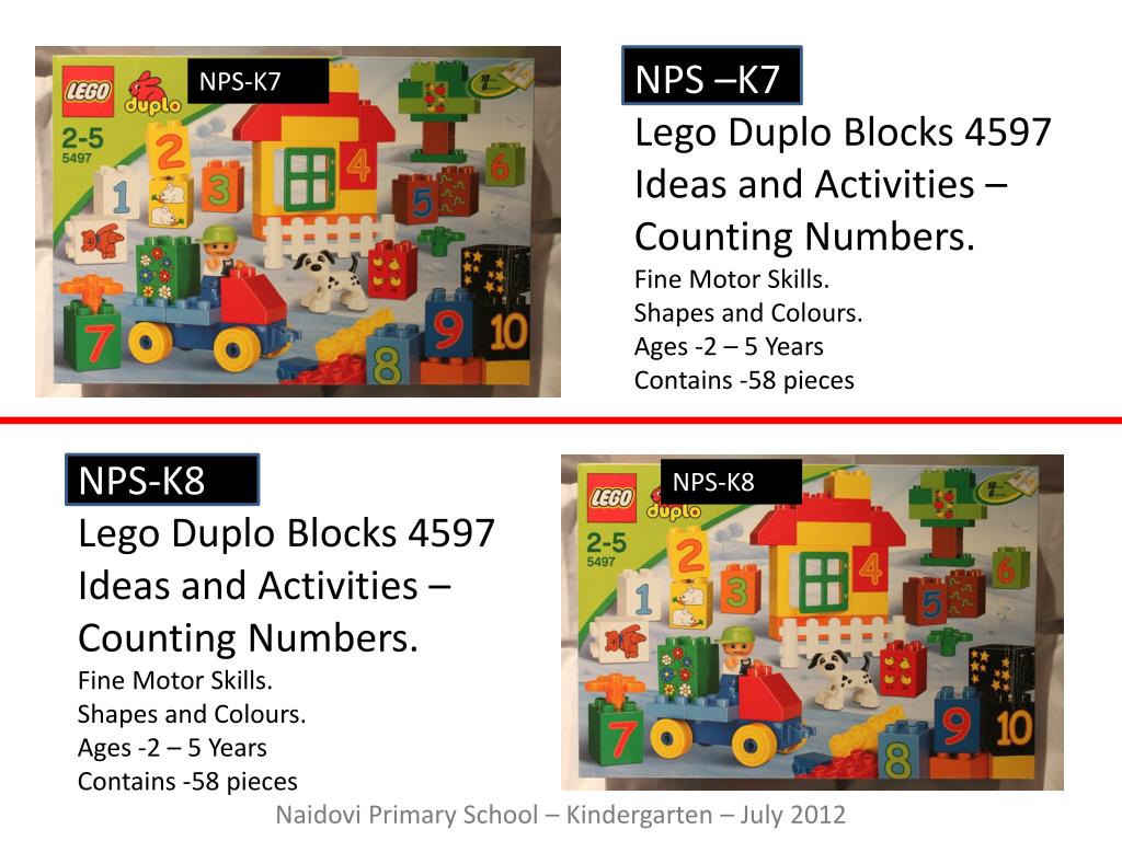 NPS –K7 Lego Duplo Blocks 4597 Ideas and Activities – Counting Numbers. Fine Motor Skills. Shapes and Colours. Ages -2 – 5 Years Contains -58 pieces NPS-K7 NPS-K8 Lego Duplo Blocks 4597 Ideas and Activities – Counting Numbers. Fine Motor Skills. Shapes and Colours. Ages -2 – 5 Years Contains -58 pieces NPS-K8 Naidovi Primary School – Kindergarten – July 2012