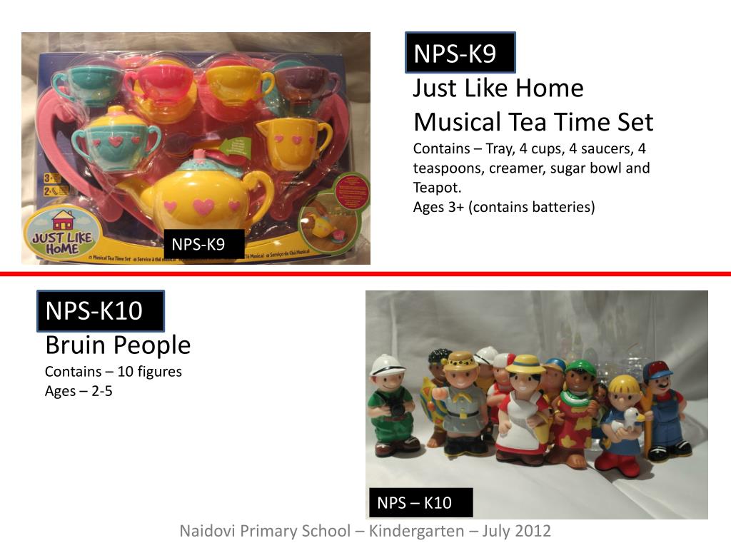 NPS-K9 Just Like Home Musical Tea Time Set Contains – Tray, 4 cups, 4 saucers, 4 teaspoons, creamer, sugar bowl and Teapot. Ages 3+ (contains batteries) NPS-K9 NPS-K10 Bruin People Contains – 10 figures Ages – 2-5 NPS – K10 Naidovi Primary School – Kindergarten – July 2012