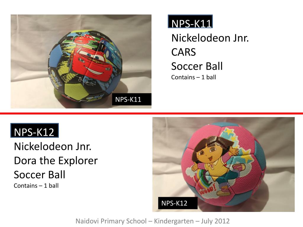NPS-K11 Nickelodeon Jnr. CARS Soccer Ball Contains – 1 ball NPS-K11 NPS-K12 Nickelodeon Jnr. Dora the Explorer Soccer Ball Contains – 1 ball NPS-K12 Naidovi Primary School – Kindergarten – July 2012