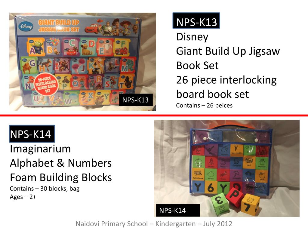 NPS-K13 Disney Giant Build Up Jigsaw Book Set 26 piece interlocking board book set Contains – 26 peices NPS-K13 NPS-K14 Imaginarium Alphabet & Numbers Foam Building Blocks Contains – 30 blocks, bag Ages – 2+ NPS-K14 Naidovi Primary School – Kindergarten – July 2012