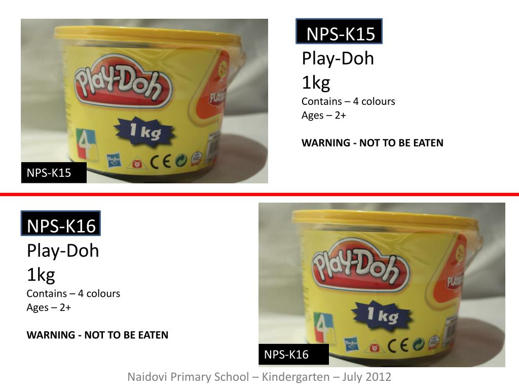 NPS-K14 NPS-K15 Play-Doh 1kg Contains – 4 colours Ages – 2+ WARNING - NOT TO BE EATEN NPS-K15 NPS-K16 Play-Doh 1kg Contains – 4 colours Ages – 2+ WARNING - NOT TO BE EATEN NPS-K16 Naidovi Primary School – Kindergarten – July 2012