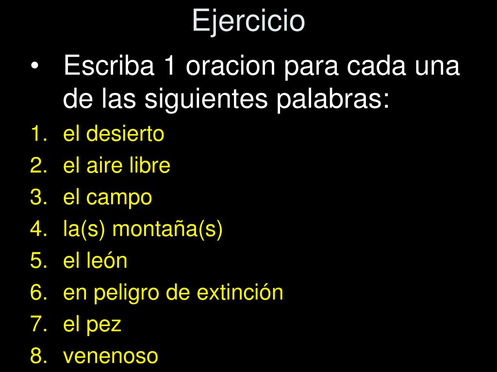 Ejercicio • Escriba 1 oracion para cada una de las siguientes palabras: • el desierto • el aire libre • el campo • la(s) montaña(s) • el león • en peligro de extinción • el pez • venenoso