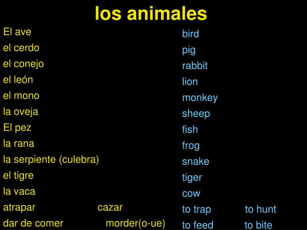 los animales El ave el cerdo el conejo el león el mono la oveja El pez la rana la serpiente (culebra) el tigre la vaca atrapar cazar dar de comer morder(o-ue) bird pig rabbit lion monkey sheep fish frog snake tiger cow to trap to hunt to feed to bite