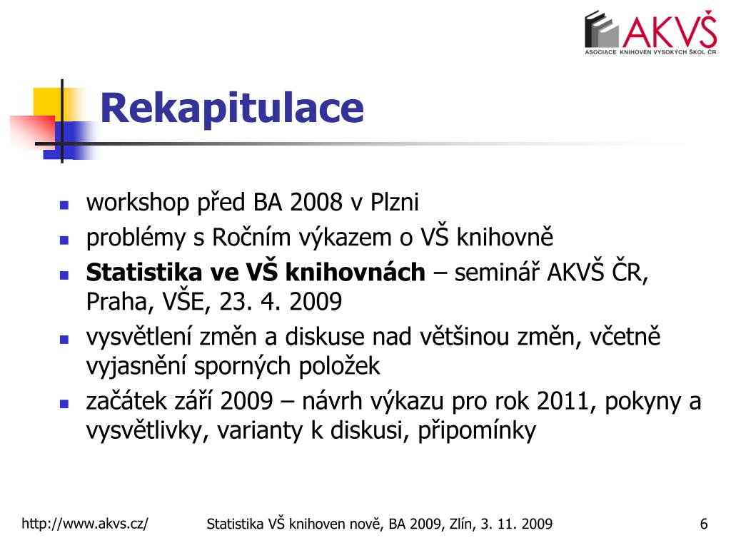 Rekapitulace • workshop před BA 2008 v Plzni • problémy s Ročním výkazem o VŠ knihovně • Statistika ve VŠ knihovnách – seminář AKVŠ ČR, Praha, VŠE, 23. 4. 2009 • vysvětlení změn a diskuse nad většinou změn, včetně vyjasnění sporných položek • začátek září 2009 – návrh výkazu pro rok 2011, pokyny a vysvětlivky, varianty k diskusi, připomínky Statistika VŠ knihoven nově, BA 2009, Zlín, 3. 11. 2009