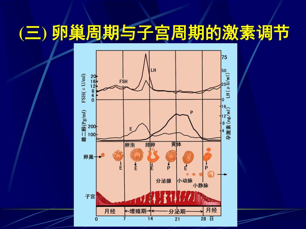 三、卵巢周期性活动的调节 (一) 下丘脑—腺垂体的调控 (二) 卵巢分泌的激素 子宫内膜周期性变化; 下丘脑—腺垂体负反 馈调节; FSH LH GnRH→→卵巢 雌激素 孕激素