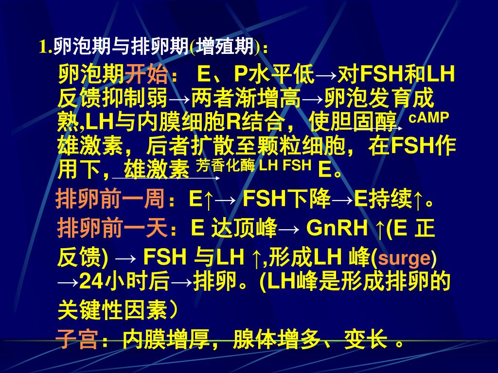 1.卵泡期与排卵期(增殖期): 卵泡期开始:E、P水平低→对FSH和LH反馈抑制弱→两者渐增高→卵泡发育成熟,LH与内膜细胞R结合,使胆固醇 cAMP雄激素,后者扩散至颗粒细胞,在FSH作用下,雄激素 芳香化酶 LH FSHE。 排卵前一周:E↑→ FSH下降→E持续↑。 排卵前一天:E 达顶峰→GnRH ↑(E 正 反馈) → FSH 与LH ↑,形成LH 峰(surge)→24小时后→排卵。(LH峰是形成排卵的 关键性因素) 子宫:内膜增厚,腺体增多、变长 。