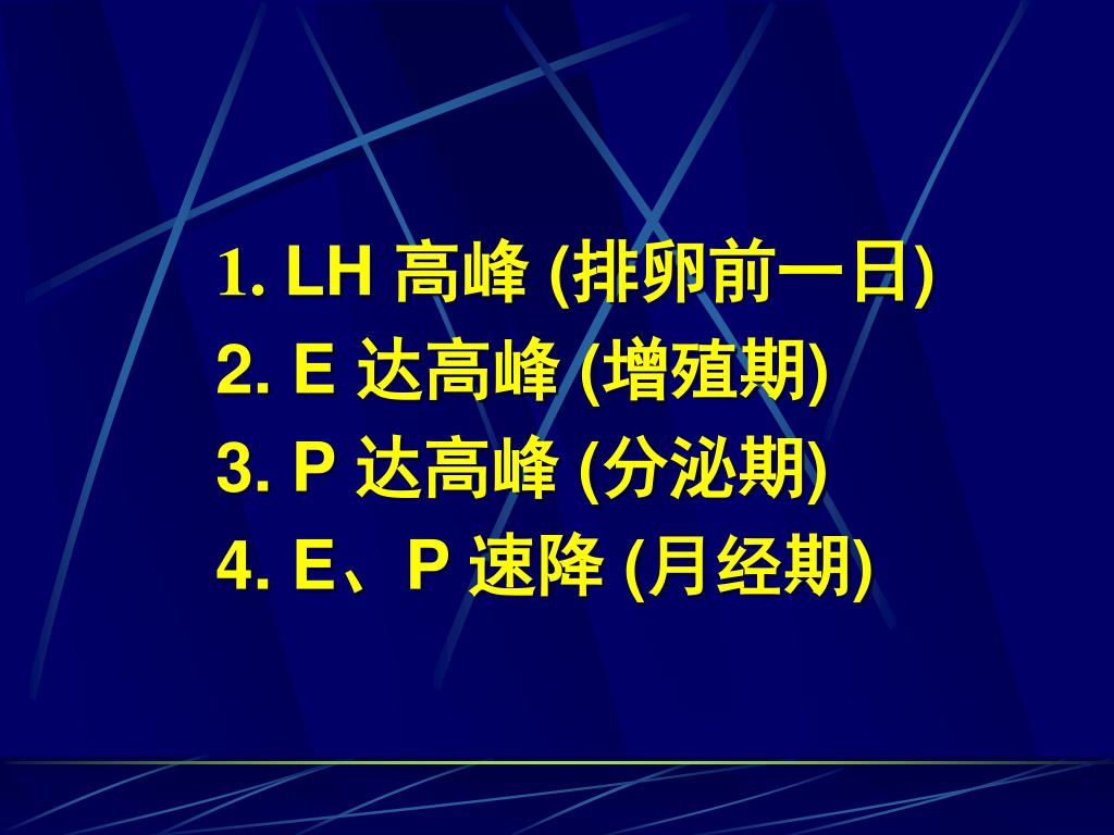 1. LH 高峰 (排卵前一日) 2. E 达高峰 (增殖期) 3. P 达高峰 (分泌期) 4. E、P 速降 (月经期)