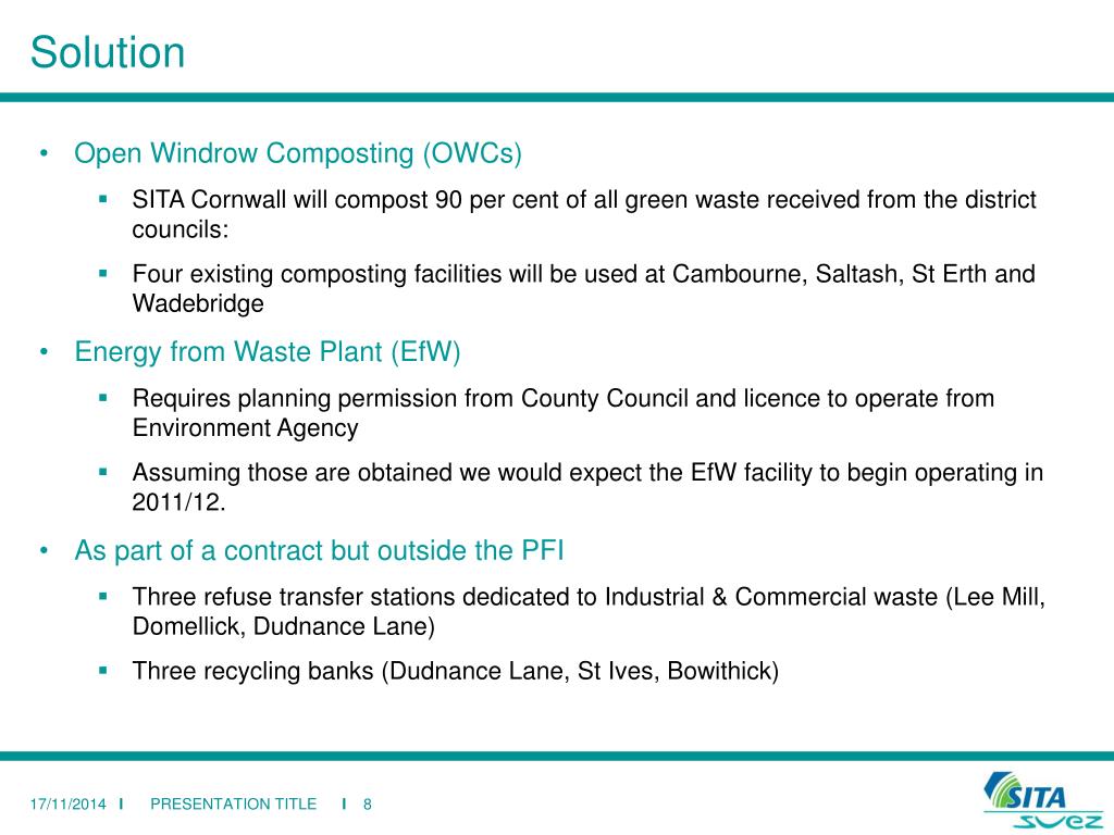 Solution • Open Windrow Composting (OWCs) • SITA Cornwall will compost 90 per cent of all green waste received from the district councils: • Four existing composting facilities will be used at Cambourne, Saltash, St Erth and Wadebridge • Energy from Waste Plant (EfW) • Requires planning permission from County Council and licence to operate from Environment Agency • Assuming those are obtained we would expect the EfW facility to begin operating in 2011/12. • As part of a contract but outside the PFI • Three refuse transfer stations dedicated to Industrial & Commercial waste (Lee Mill, Domellick, Dudnance Lane) • Three recycling banks (Dudnance Lane, St Ives, Bowithick)