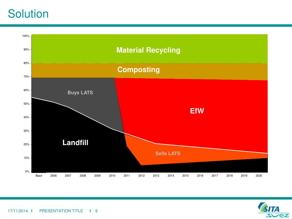 SITA UK Leading UK Waste Management Company 5,000 Employees 480 £ Million Turnover 10 Million Tonnes of Waste 79 Local Authority Contracts 3 Long Term Integrated Waste PFI contracts 4 Long Term Treatment PFI/PPP contracts 4 Energy from Waste Plants 10 Materials Recycling/Sorting Facilities 12 Composting Plants 36 Active landfills 45 Refuse Transfer Stations 97 Household Waste Recycling Centres 1,900 Vehicles 35,000 Commercial Customers