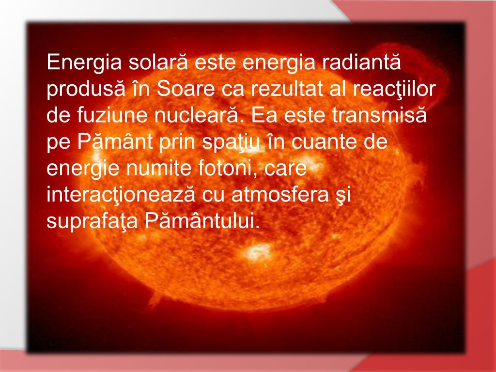 Energia solara. Energia solară este energia radiantă produsă în Soare ca rezultat al reacţiilor de fuziune nucleară. Ea este transmisă pe Pământ prin spaţiu în cuante de energie numite fotoni, care interacţionează cu atmosfera şi suprafaţa Pământului. . Energia solară poate fi folosită să: