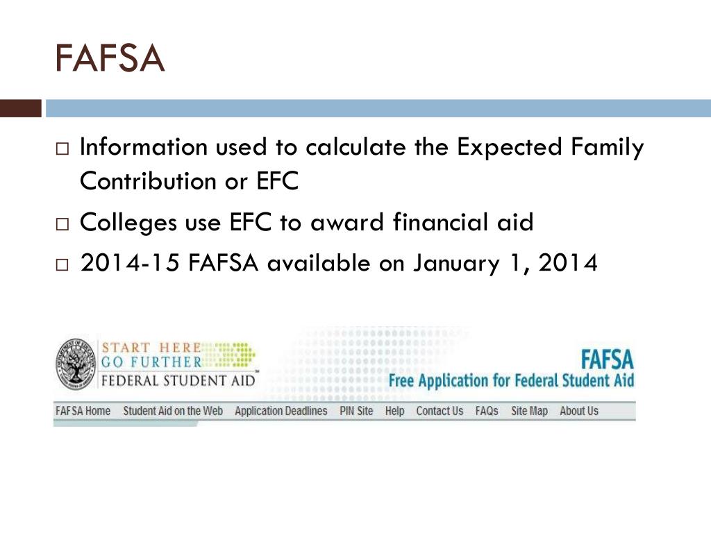 FAFSA • Information used to calculate the Expected Family Contribution or EFC • Colleges use EFC to award financial aid • 2014-15 FAFSA available on January 1, 2014