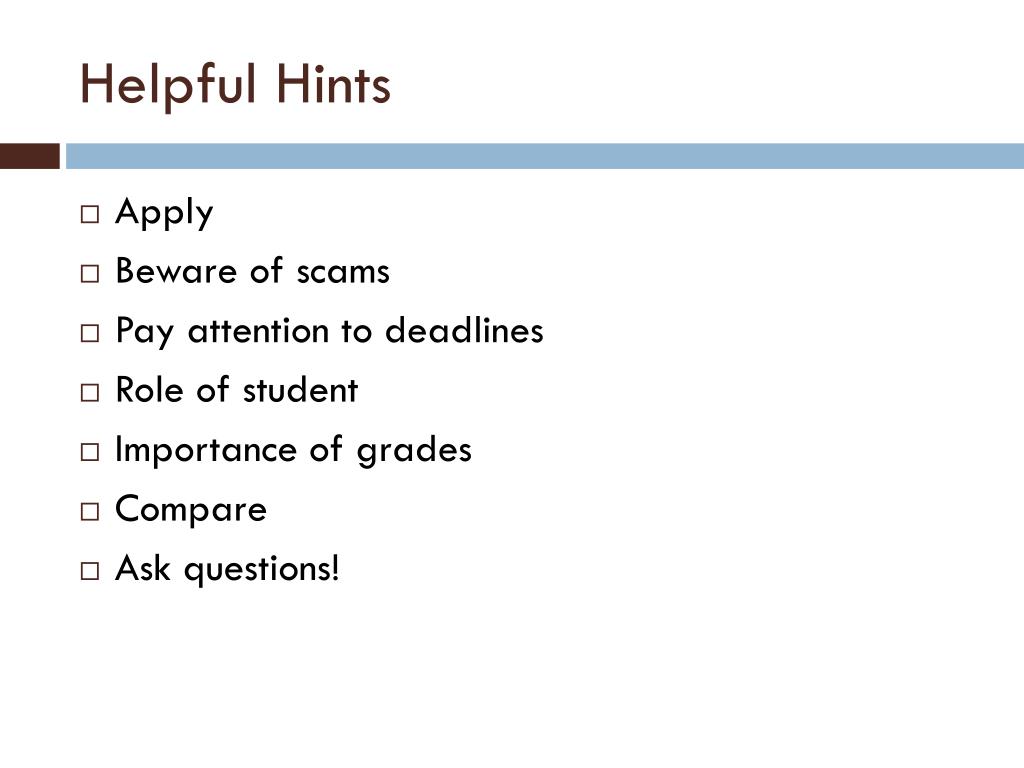 Helpful Hints • Apply • Beware of scams • Pay attention to deadlines • Role of student • Importance of grades • Compare • Ask questions!