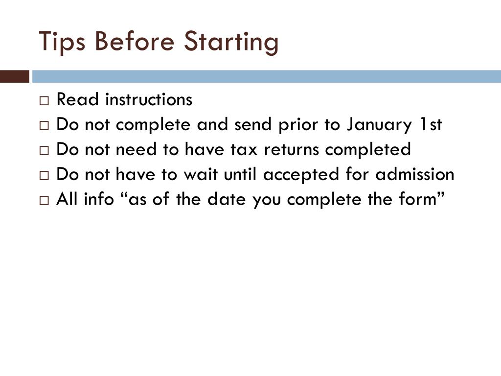 Tips Before Starting • Read instructions • Do not complete and send prior to January 1st • Do not need to have tax returns completed • Do not have to wait until accepted for admission • All info “as of the date you complete the form”