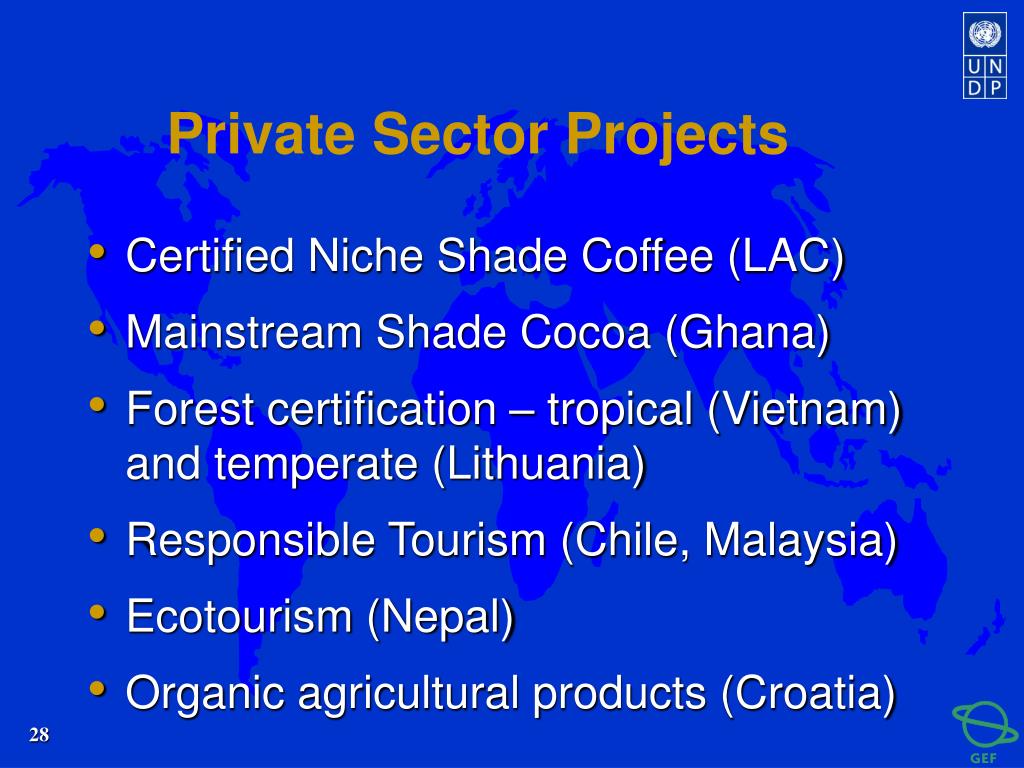 Private Sector Projects • Certified Niche Shade Coffee (LAC) • Mainstream Shade Cocoa (Ghana) • Forest certification – tropical (Vietnam) and temperate (Lithuania) • Responsible Tourism (Chile, Malaysia) • Ecotourism (Nepal) • Organic agricultural products (Croatia)