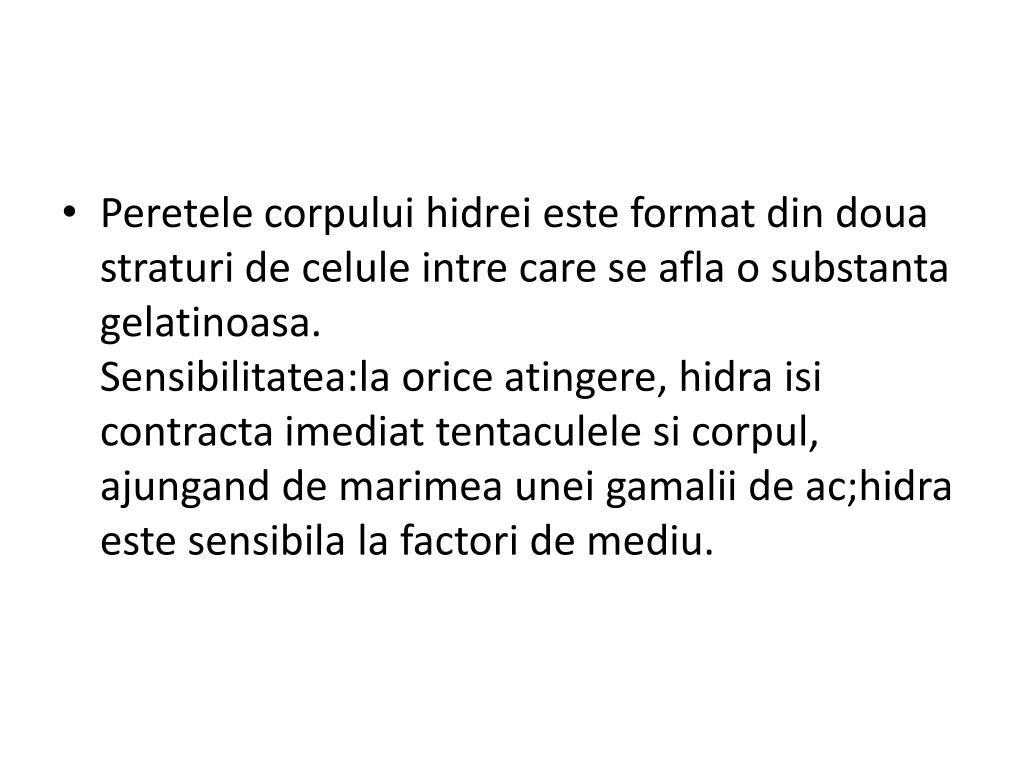 Peretelecorpuluihidreieste format din douastraturi de celuleintre care se afla o substantagelatinoasa.Sensibilitatea:laoriceatingere, hidraisicontractaimediattentaculelesicorpul, ajungand de marimeauneigamalii de ac;hidraestesensibila la factori de mediu.
