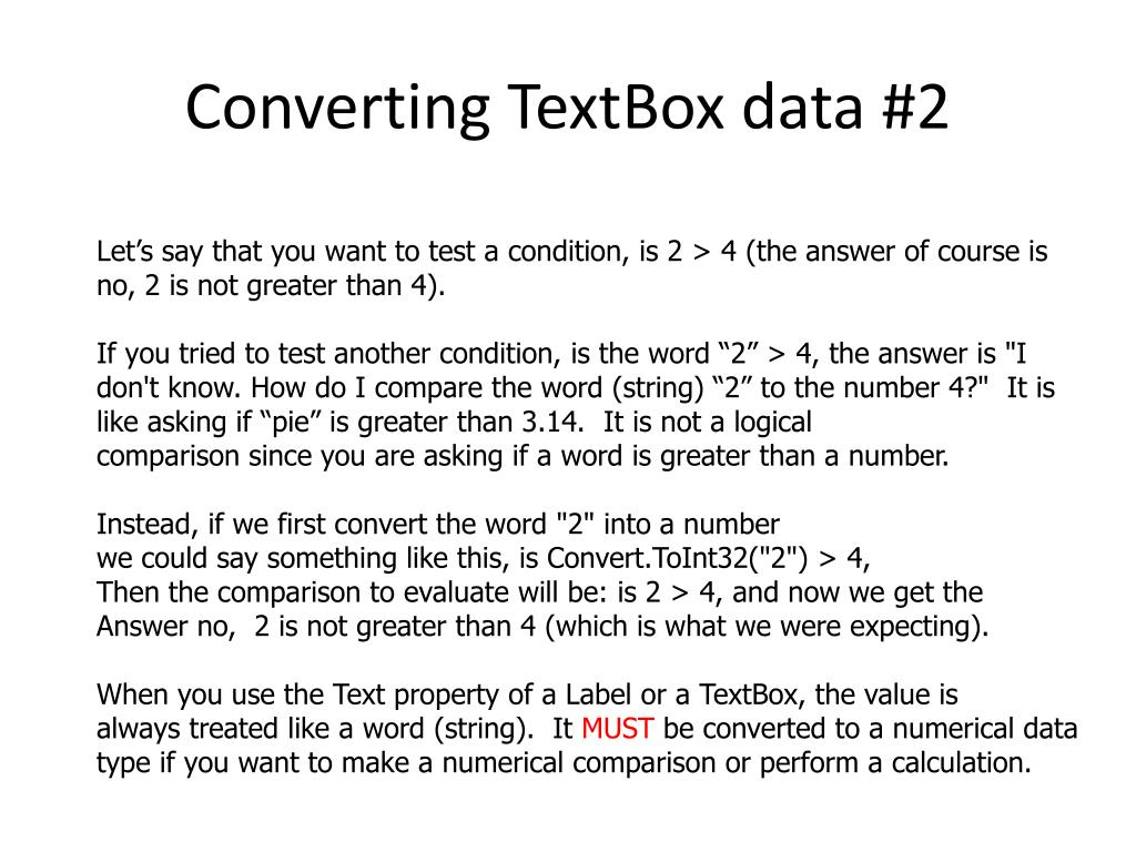 Converting TextBoxdata #2 Let’s say that you want to test a condition, is 2 > 4 (the answer of course is no, 2 isnot greater than 4).If you tried to test another condition, is the word “2” > 4, the answer is "Idon't know. How do I compare the word (string) “2” to the number 4?" It islike asking if “pie” is greater than 3.14. It is not a logicalcomparison since you are asking if a word is greater than a number.Instead, if we first convert the word "2" into a numberwe could say something like this, is Convert.ToInt32("2") > 4, Then the comparison to evaluate will be: is 2 > 4, and now we get the Answer no, 2 is not greater than 4 (which is what we were expecting).When you use the Text property of a Label or a TextBox, the value isalways treated like a word (string). It MUST be converted to a numerical datatype if you want to make a numerical comparison or perform a calculation.