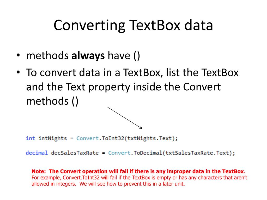 Converting TextBox data • methods always have () • To convert data in a TextBox, list the TextBox and the Text property inside the Convert methods () Note: The Convert operation will fail if there is any improper data in the TextBox. For example, Convert.ToInt32 will fail if the TextBox is empty or has any characters that aren’t allowed in integers. We will see how to prevent this in a later unit.