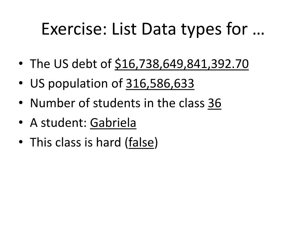 Exercise: List Data types for … • The US debt of $16,738,649,841,392.70 • US population of 316,586,633 • Number of students in the class 36 • A student: Gabriela • This class is hard (false)