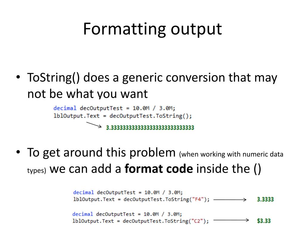 Formatting output • ToString() does a generic conversion that may not be what you want • To get around this problem (when working with numeric data types) we can add a format code inside the ()