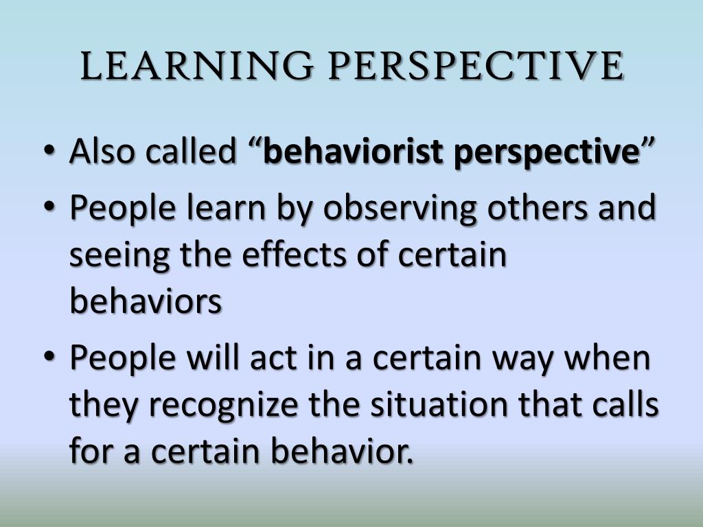 LEARNING PERSPECTIVE • Also called “behaviorist perspective” • People learn by observing others and seeing the effects of certain behaviors • People will act in a certain way when they recognize the situation that calls for a certain behavior.