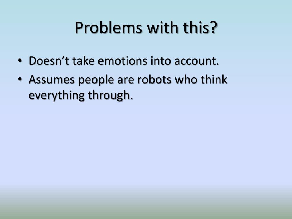 Problems with this? • Doesn’t take emotions into account. • Assumes people are robots who think everything through.