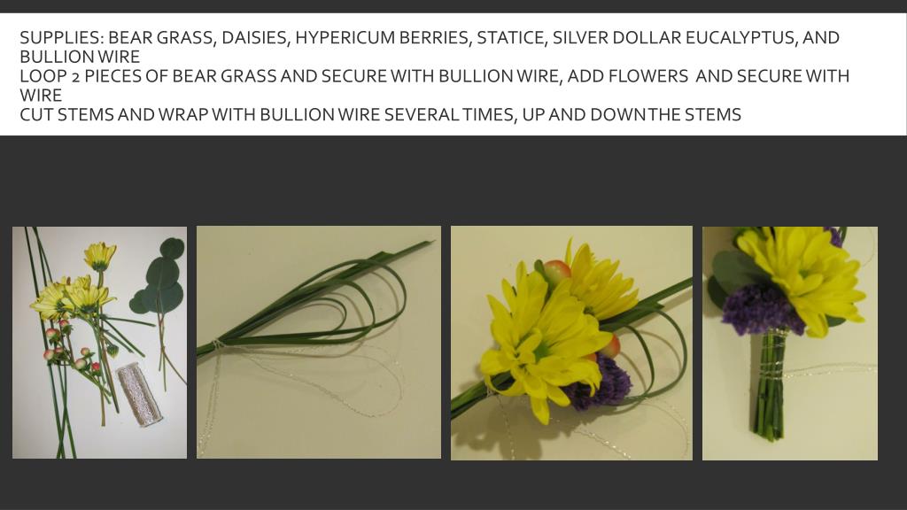 Supplies: bear grass, daisies, hypericum berries, statice, silver dollar eucalyptus, and bullion wireLoop 2 pieces of bear grass and secure with bullion wire, add flowers and secure with wireCut stems and wrap with bullion wire several times, up and down the stems