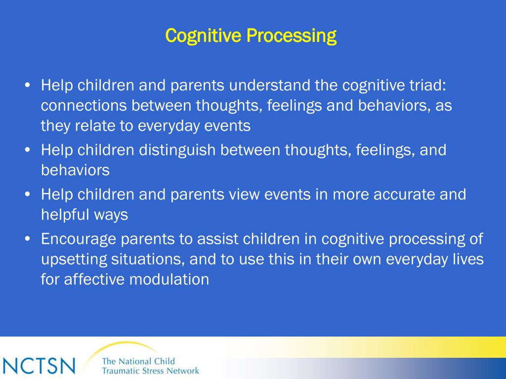 Cognitive Processing • Help children and parents understand the cognitive triad: connections between thoughts, feelings and behaviors, as they relate to everyday events • Help children distinguish between thoughts, feelings, and behaviors • Help children and parents view events in more accurate and helpful ways • Encourage parents to assist children in cognitive processing of upsetting situations, and to use this in their own everyday lives for affective modulation