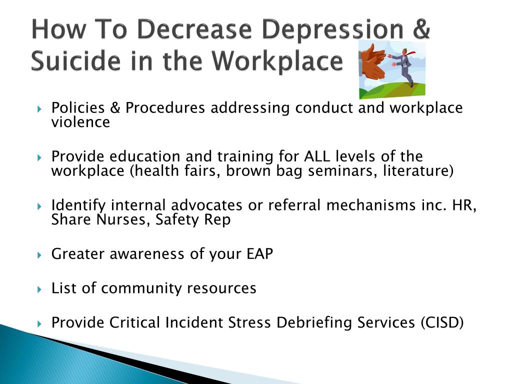 How To Decrease Depression & Suicide in the Workplace • Policies & Procedures addressing conduct and workplace violence • Provide education and training for ALL levels of the workplace (health fairs, brown bag seminars, literature) • Identify internal advocates or referral mechanisms inc. HR, Share Nurses, Safety Rep • Greater awareness of your EAP • List of community resources • Provide Critical Incident Stress Debriefing Services (CISD)