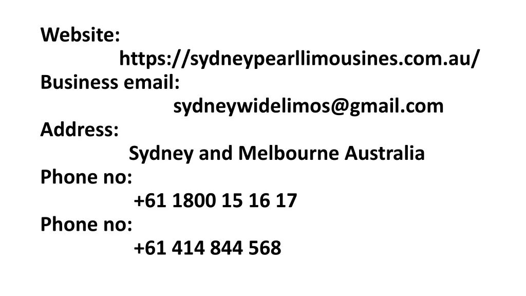 Website: https://sydneypearllimousines.com.au/Business email: sydneywidelimos@gmail.comAddress: Sydney and Melbourne AustraliaPhone no: +61 1800 15 16 17 Phone no: +61 414 844 568