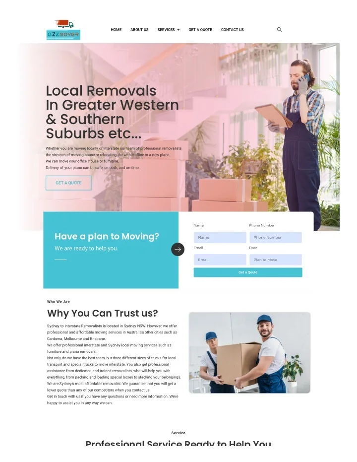 HOME ABOUT US SERVICES GET A QUOTE CONTACT US Local Removals In Greater Western & Southern Suburbs etc... Whether you are moving locally or interstate our team of professional removalists the stresses of moving house or relocating the whole o?ce to a new place. We can move your o?ce, house or furniture. Delivery of your piano can be safe, smooth, and on time. GET A QUOTE Name Phone Number Have a plan to Moving? We are ready to help you. Name Phone Number Email Date Email Plan to Move Get a Qoute Who We Are Why You Can Trust us? Sydney to interstate Removalists is located in Sydney NSW. However, we offer professional and affordable moving services in Australia’s other cities such as Canberra, Melbourne and Brisbane. We offer professional interstate and Sydney-local moving services such as furniture and piano removals. Not only do we have the best team, but three different sizes of trucks for local transport and special trucks to move interstate. You also get professional assistance from dedicated and trained removalists, who will help you with everything, from packing and loading special boxes to stacking your belongings. We are Sydney’s most affordable removalist. We guarantee that you will get a lower quote than any of our competitors when you contact us. Get in touch with us if you have any questions or need more information. We’re happy to assist you in any way we can. Service Professional Service Ready to Help You