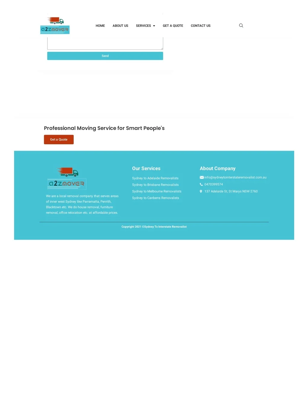 Phone Email ABOUT US HOME SERVICES GET A QUOTE CONTACT US Message Send Professional Moving Service for Smart People's Get a Quote Our Services About Company info@sydneytointerstateremovalist.com.au Sydney to Adelaide Removalists 0470399574 Sydney to Brisbane Removalists Sydney to Melbourne Removalists 137 Adelaide St, St Marys NSW 2760 We are a local removal company that serves areas Sydney to Canberra Removalists of inner west Sydney like Parramatta, Penrith, Blacktown etc. We do house removal, furniture removal, o?ce relocation etc. at affordable prices. Copyright 2021 ©Sydney To Interstate Removalist