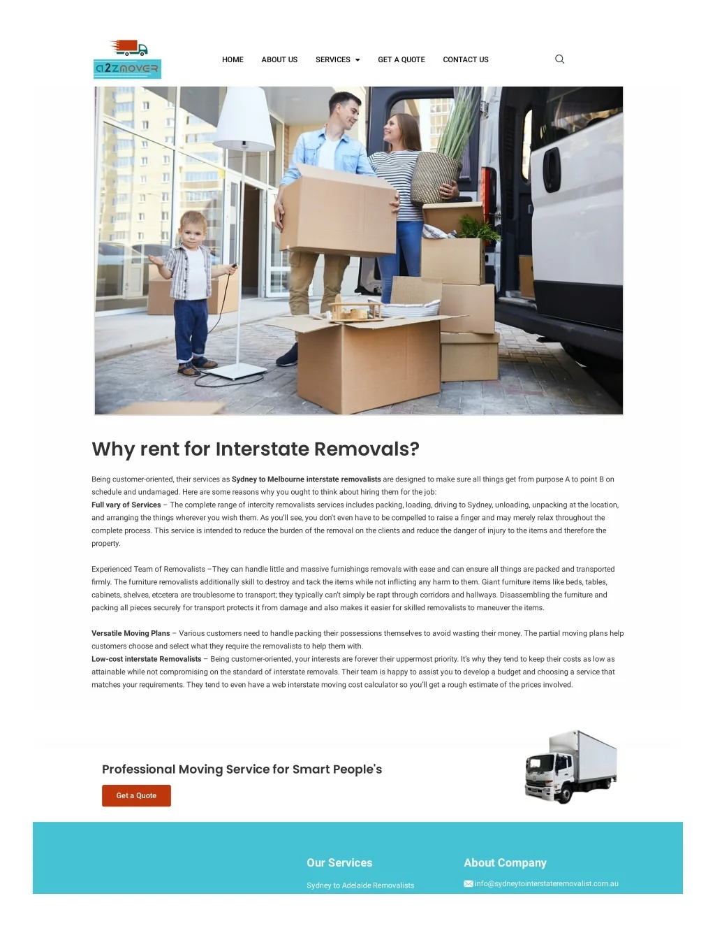 HOME ABOUT US SERVICES GET A QUOTE CONTACT US Why rent for Interstate Removals? Being customer-oriented, their services as Sydney to Melbourne interstate removalists are designed to make sure all things get from purpose A to point B on schedule and undamaged. Here are some reasons why you ought to think about hiring them for the job: Full vary of Services – The complete range of intercity removalists services includes packing, loading, driving to Sydney, unloading, unpacking at the location, and arranging the things wherever you wish them. As you’ll see, you don’t even have to be compelled to raise a ?nger and may merely relax throughout the complete process. This service is intended to reduce the burden of the removal on the clients and reduce the danger of injury to the items and therefore the property. Experienced Team of Removalists –They can handle little and massive furnishings removals with ease and can ensure all things are packed and transported ?rmly. The furniture removalists additionally skill to destroy and tack the items while not in?icting any harm to them. Giant furniture items like beds, tables, cabinets, shelves, etcetera are troublesome to transport; they typically can’t simply be rapt through corridors and hallways. Disassembling the furniture and packing all pieces securely for transport protects it from damage and also makes it easier for skilled removalists to maneuver the items. Versatile Moving Plans – Various customers need to handle packing their possessions themselves to avoid wasting their money. The partial moving plans help customers choose and select what they require the removalists to help them with. Low-cost interstate Removalists – Being customer-oriented, your interests are forever their uppermost priority. It’s why they tend to keep their costs as low as attainable while not compromising on the standard of interstate removals. Their team is happy to assist you to develop a budget and choosing a service that matches your requirements. They tend to even have a web interstate moving cost calculator so you’ll get a rough estimate of the prices involved. Professional Moving Service for Smart People's Get a Quote Our Services About Company info@sydneytointerstateremovalist.com.au Sydney to Adelaide Removalists