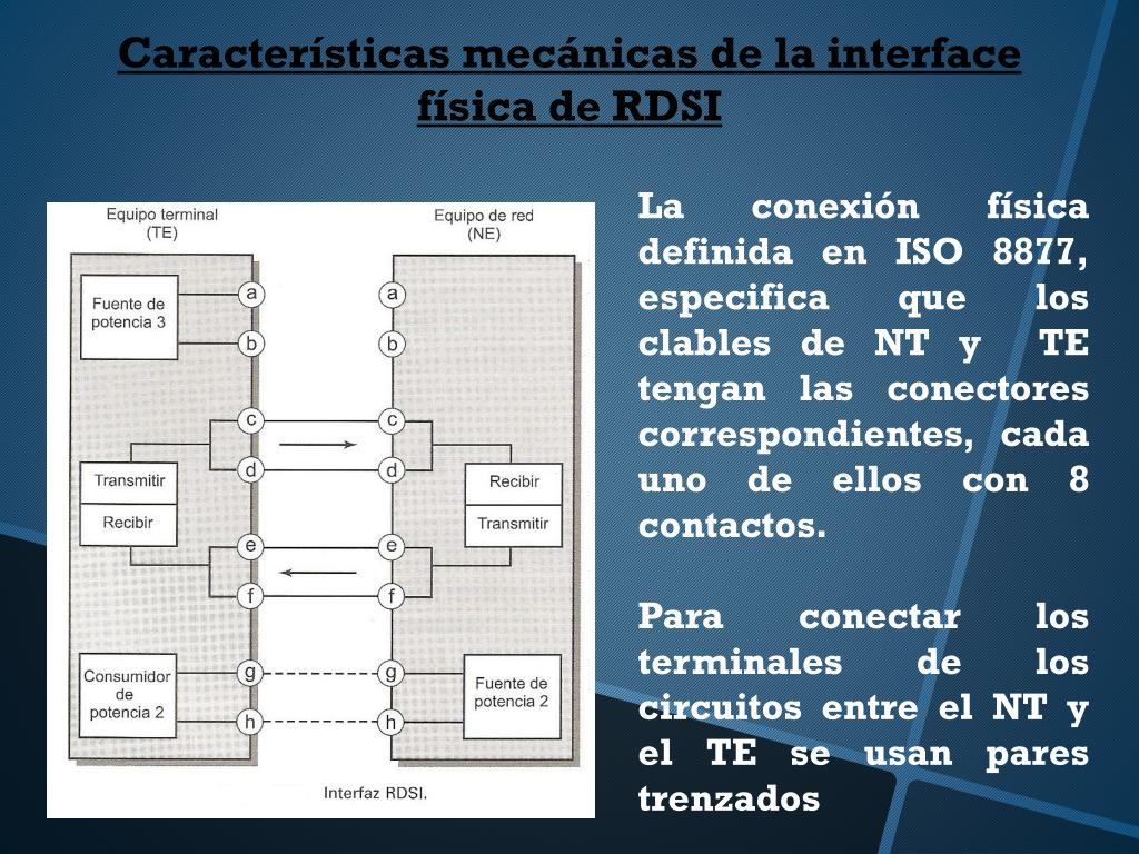 Características mecánicas de la interface • física de RDSI La conexión física definida en ISO 8877, especifica que los clables de NT y TE tengan las conectores correspondientes, cada uno de ellos con 8 contactos. Para conectar los terminales de los circuitos entre el NT y el TE se usan pares trenzados