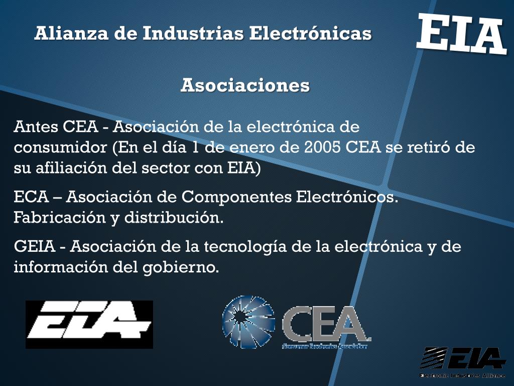 Alianza de Industrias Electrónicas EIA Asociaciones Antes CEA - Asociación de la electrónica de consumidor (En el día 1 de enero de 2005 CEA se retiró de su afiliación del sector con EIA) ECA – Asociación de Componentes Electrónicos. Fabricación y distribución. GEIA - Asociación de la tecnología de la electrónica y de información del gobierno.