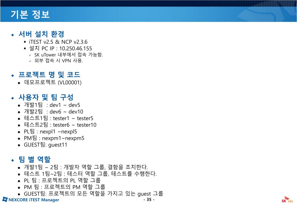 기본 정보 • 서버 설치 환경 • iTEST v2.5 & NCP v2.3.6 • 설치 PC IP : 10.250.46.155 • SK uTower 내부에서 접속 가능함. • 외부 접속 시 VPN 사용. • 프로젝트 명 및 코드 • 데모프로젝트 (VL00001) • 사용자 및 팀 구성 • 개발1팀 : dev1 ~ dev5 • 개발2팀 : dev6 ~ dev10 • 테스트1팀 : tester1 ~ tester5 • 테스트2팀 : tester6 ~ tester10 • PL팀 : nexpl1 ~nexpl5 • PM팀 : nexpm1~nexpm5 • GUEST팀: guest11 • 팀 별 역할 • 개발1팀 ~ 2팀 : 개발자 역할 그룹, 결함을 조치한다. • 테스트 1팀~2팀 : 테스터 역할 그룹, 테스트를 수행한다. • PL 팀 : 프로젝트의 PL 역할 그룹 • PM 팀 : 프로젝트의 PM 역할 그룹 • GUEST팀: 프로젝트의모든 역할을 가지고 있는 guest 그룹