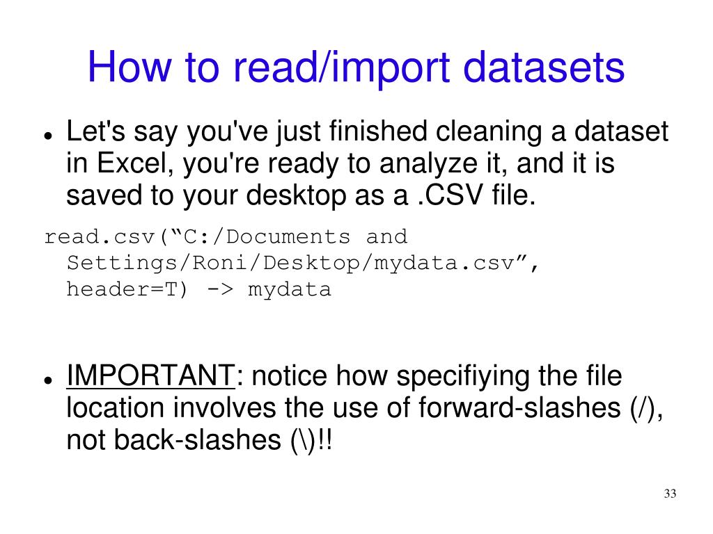 How to read/import datasets • Let's say you've just finished cleaning a dataset in Excel, you're ready to analyze it, and it is saved to your desktop as a .CSV file. read.csv(“C:/Documents and Settings/Roni/Desktop/mydata.csv”, header=T) -> mydata • IMPORTANT: notice how specifiying the file location involves the use of forward-slashes (/), not back-slashes (\)!!