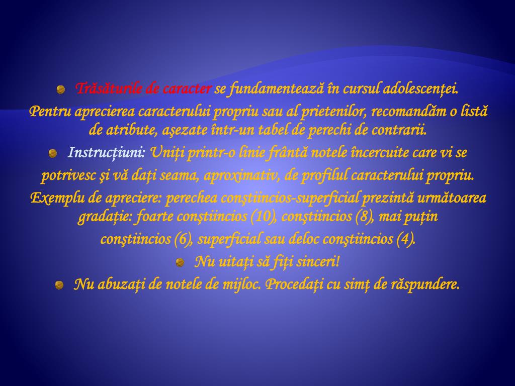 Trăsăturilede caracterse fundamenteazăîn cursuladolescenţei. Pentruapreciereacaracteruluipropriusau al prietenilor, recomandăm o listă de atribute, aşezateîntr-un tabel de perechi de contrarii. • Instrucţiuni: Uniţiprintr-o liniefrântănoteleîncercuite care vi se potrivescşi vă daţiseama,aproximativ, de profilulcaracteruluipropriu. Exemplu de apreciere: perechea conştiincios-superficial prezintăurmătoareagradaţie: foarte conştiincios (10), conştiincios (8), maipuţin conştiincios (6), superficial saudeloc conştiincios (4). • Nu uitaţi să fiţisinceri! • Nu abuzaţi de notele de mijloc. Procedaţi cu simţ de răspundere.