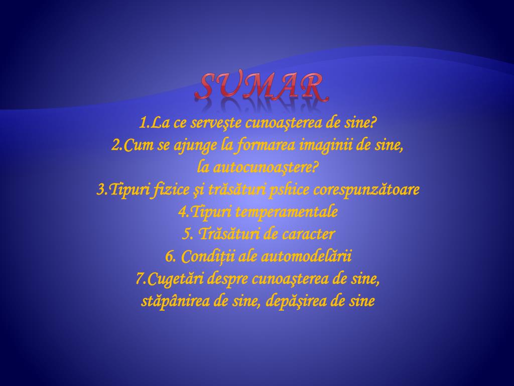 Sumar 1.La ce serveştecunoaşterea de sine? 2.Cum se ajunge la formareaimaginii de sine, la autocunoaştere? 3.Tipuri fiziceşitrăsăturipshicecorespunzătoare 4.Tipuri temperamentale 5. Trăsături de caracter 6. Condiţii ale automodelării 7.Cugetăridesprecunoaşterea de sine, stăpânirea de sine, depăşirea de sine