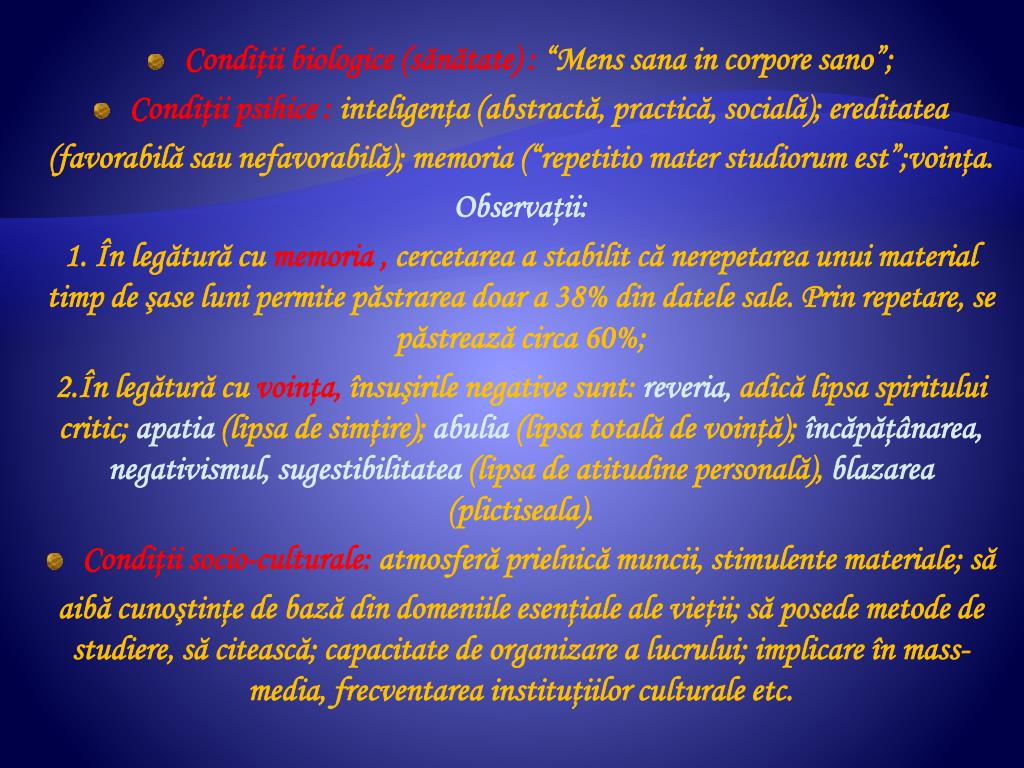 Condiţii biologice (sănătate) : “Menssana in corporesano”; • Condiţii psihice : inteligenţa (abstractă, practică, socială); ereditatea (favorabilăsaunefavorabilă); memoria (“repetitio mater studiorumest”;voinţa. Observaţii: 1. În legătură cu memoria ,cercetarea a stabilit cănerepetareaunui material timp de şaselunipermite păstrareadoar a 38% din datele sale. Prinrepetare, se păstrează circa 60%; 2.În legătură cu voinţa,însuşirile negative sunt: reveria, adicălipsaspiritului critic; apatia(lipsa de simţire); abulia (lipsa totală devoinţă); încăpăţânarea, negativismul, sugestibilitatea(lipsa de atitudine personală), blazarea (plictiseala). • Condiţii socio-culturale: atmosferăprielnicămuncii, stimulentemateriale; să aibăcunoştinţe de bază din domeniileesenţiale ale vieţii; săposedemetode de studiere, săcitească; capacitate de organizare a lucrului; implicareîn mass-media, frecventareainstituţiilorculturale etc.